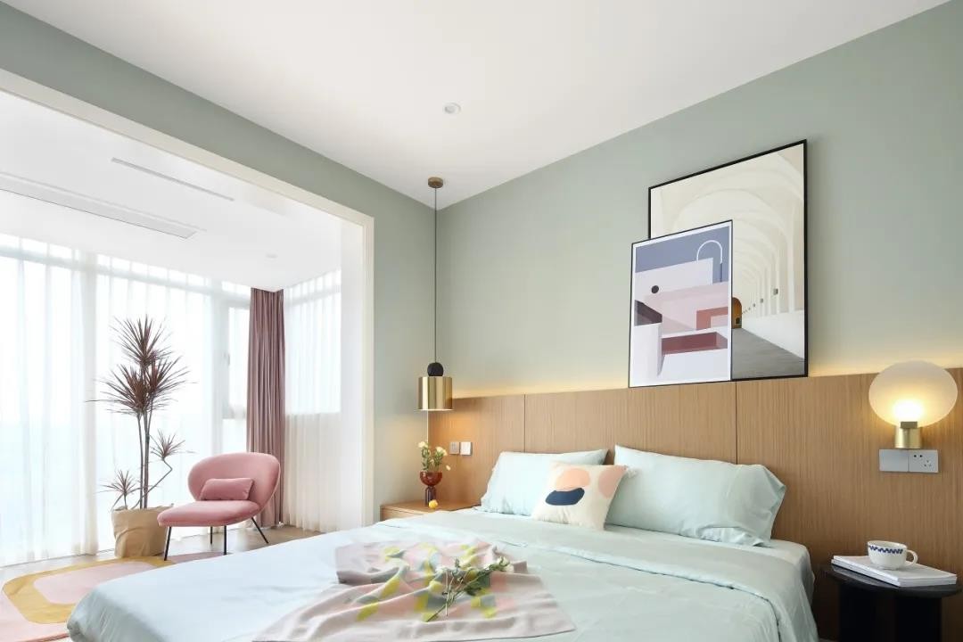 臥室空間整體淡藍色的墻面,床頭墻的墻腳是木飾面的材質,加入壁燈吊燈與燈帶,布置裝飾畫,簡約自然的床單,讓空間顯得清新優雅而文藝。